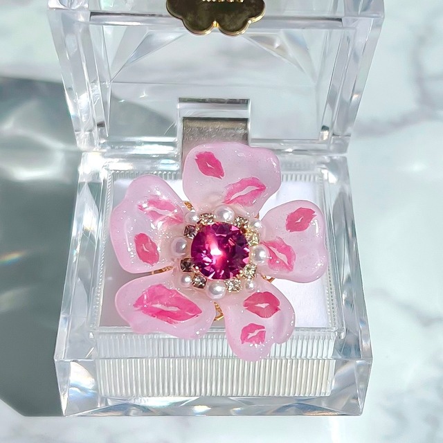 大胆なリップマークが目を惹く♡ 遊び心たっぷりのYUKInoHANA-xoxo- 優しいピンクの花びらに浮かぶリップマークが ガーリー&ちょっぴりセクシーな印象をプラスします まるで 恋の予感を感じるような 可憐さの中に少しの遊び心と大人の魅力をプラスしたデザイン デートやお出かけなど "ときめきたい日"に ぴったりのアクセサリーです おそろいのピアス/イヤリングと一緒につければ おしゃれ度がワンランクアップ! https://himawarimt.thebase.in/items/125270005 【クリスタル】 クリスタルパール 【サイズ】 リング 11号(調整可能なフリーサイズ) 【素材】 ドイツ製アクリルパーツ、クリスタルガラス、樹脂パール、真鍮 【ラッピング】 リングケースにお入れしてリボンをかけてお届けいたします。 リングをリングケースから取り出す際は、リング台部分を持って取り出していただくようお願いいたします。 ▽ ご購入前に 特商法とこちらを必ずお読みください⇨ https://himawarimt.thebase.in/items/29155326