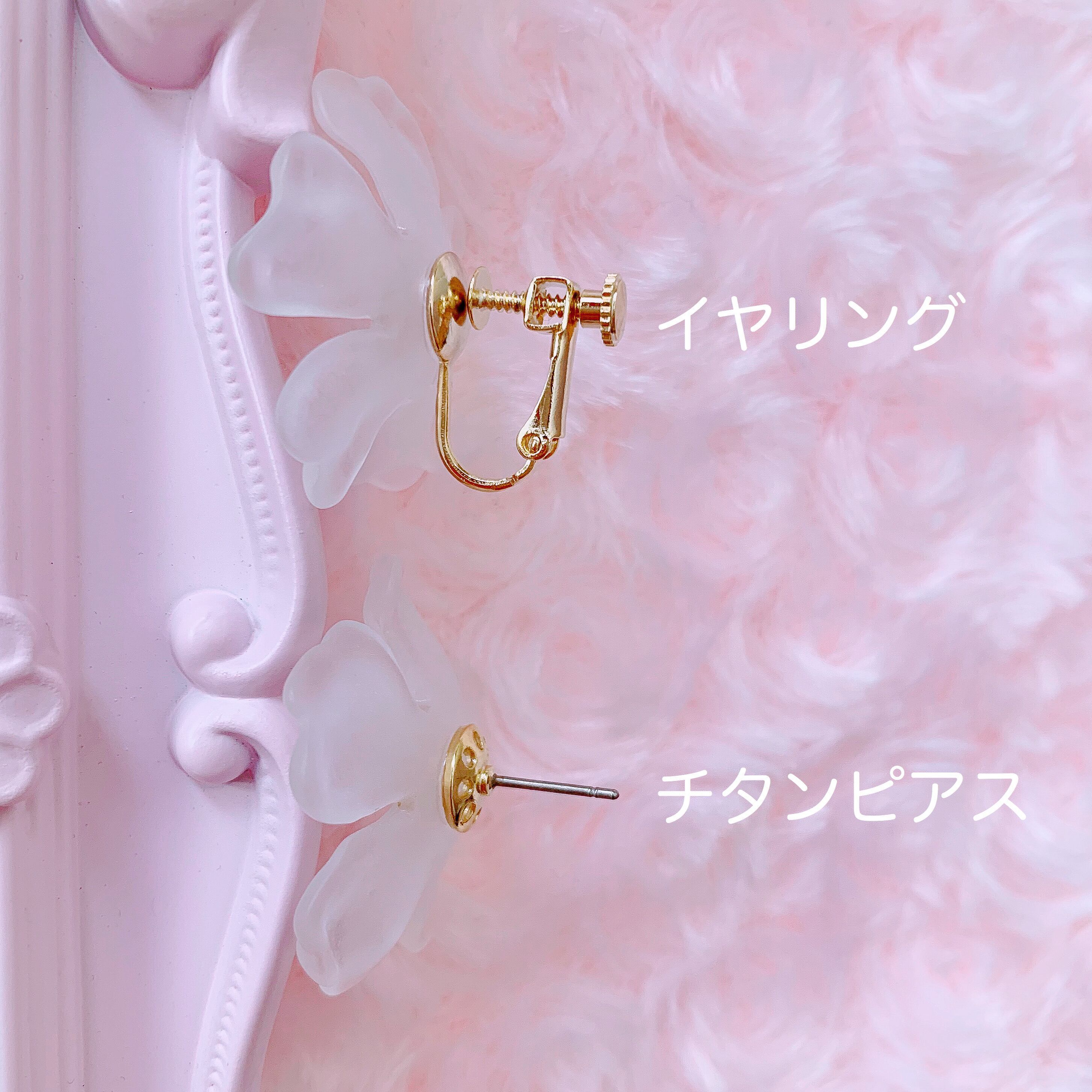 また、イヤリングの方がお花が上向き(前向き)にキレイにお付けいただけるので、イヤリングがおすすめです。